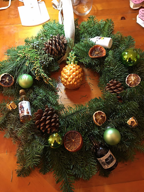 I had bought two pineapple ornaments last year that dismayed me--they were rather large and disproportionate for my pencil tree. I decided to use them to instead embellish two Christmas wreaths for my nephew and niece. I decorated a wreath for Josh already last weekend, but it looked a bit barren. Balls! It needed more balls. Better I think with more balls. I also hot glued some more citrus slices. Josh will also get a boozy gift basket for making more piƱa coladas.