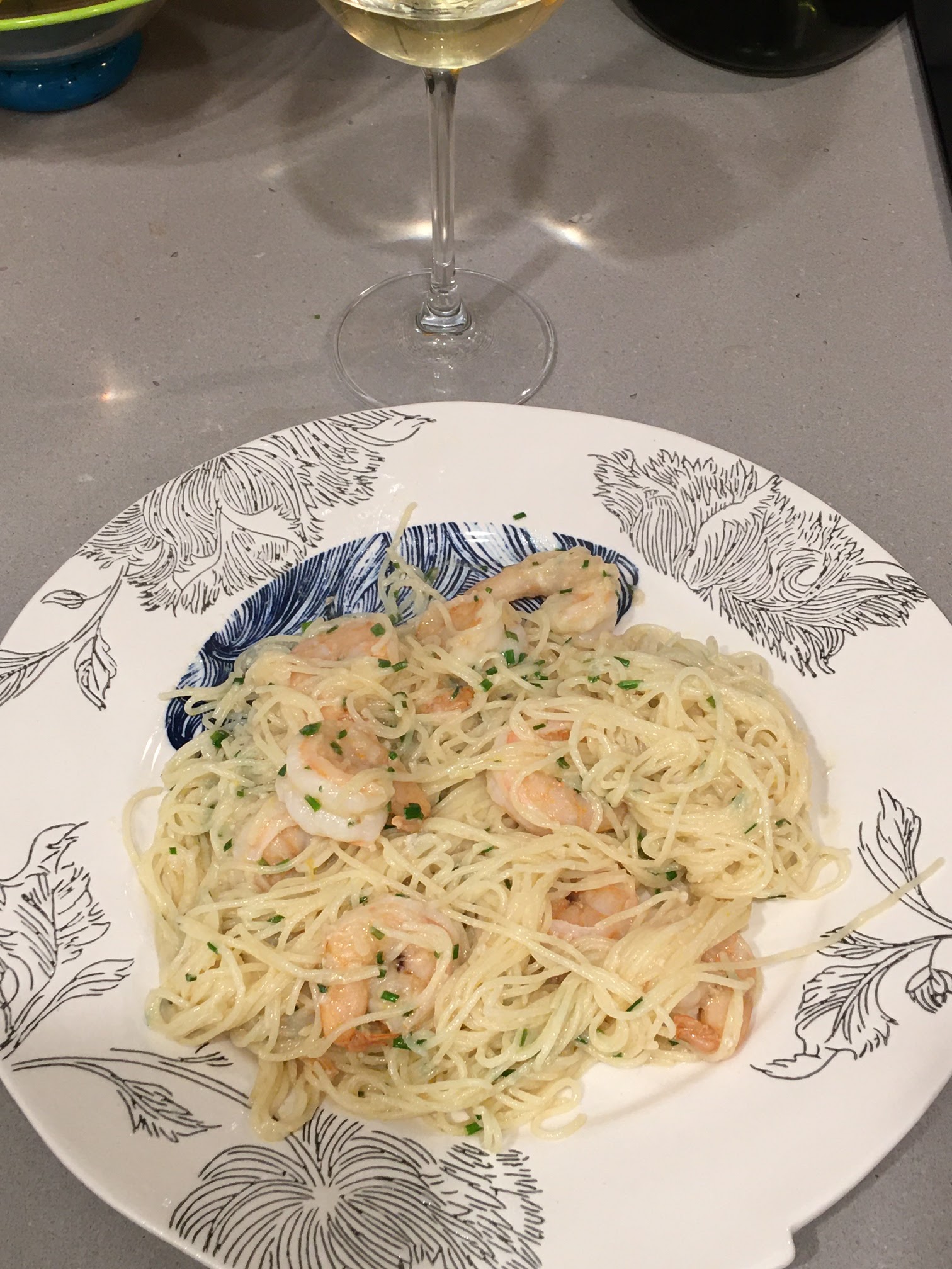 I feel like cooking is my activity for mindfulness and emotional regulation and helps a lot with my tolerance for distress. Patrick saw me defrosting and peeling shrimp for my mung bean soup and asked, what about us? and said that he also liked shrimp. Enter shrimp scampi and pasta. This Italian-American dish is one I can make from memory and not have to look at a recipe. Chop shallots (or onion) and mince garlic, which you sauté in butter and then add wine, lemon juice, shrimp stock--and any of these deglazing liquids can be omitted if you don't have it. Then reduce all those liquids until there's only enough to cook your shrimp and coat your pasta. Add heavy whipping cream to thicken and finish to a sauce. Meanwhile, depending how long it takes, get a pot of water and a handful of salt to a rolling boil in which to put whatever pasta you have on hand--linguine is what I usually use, but I've used spaghetti, rotini, farfalle and on this particular Friday night, angel hair or cappellini.