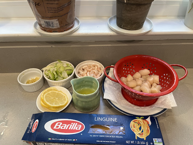 But then I also thought, Oh I should cook the instant Dan Dan mix and hunted for the lamb and started to pull bottles of sesame oil, tamari, fish sauce and seasoning sauce, which also meant taking out Sichuan peppercorns, Sichuan chili flakes, star anise, curry powder, coriander power, white pepper, sesame seeds as well as smashing more garlic. And I finished the Dan Dan lamb mixture, but then there went swimming. I was kind of upset, and that's why I'm up early this morning to get the workout done before the day's tasks soon lean into bedtime. Cooking the seafood linguine after my noodle mix was done was automatic.