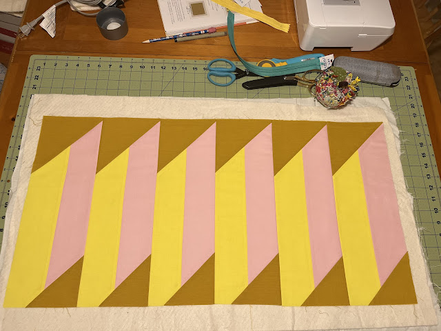 I didn't have to trim 1/2" sides like I did with Isla's pillow to square the strips, and so this pillow came out much larger. I formed the sandwich with the quilt top, batting, and muslin.